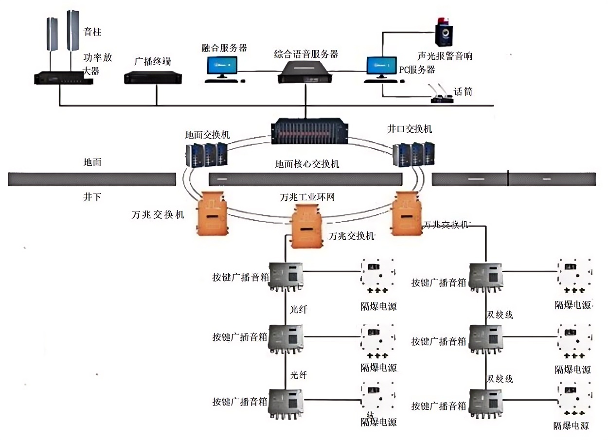 The mining broadcasting communication system adopts TCP/IP and a new type of bus as communication protocols, mainly distributed in positions such as tunnels, waiting rooms, monkey car lines, belt lines, coal mining working faces, and excavation working faces. It can completely eliminate call blind spots, so that underground workers and rest personnel can clearly hear the sound of the speaker broadcast and alarm voice, and can communicate with the above and below the well through intercom speakers. In emergency situations, dispatchers can promptly notify underground workers to evacuate and evacuate quickly based on specific circumstances, and provide necessary information assistance for safety measures and emergency rescue. It can minimize the occurrence of safety accidents and minimize the losses caused by safety accidents to the greatest extent possible.